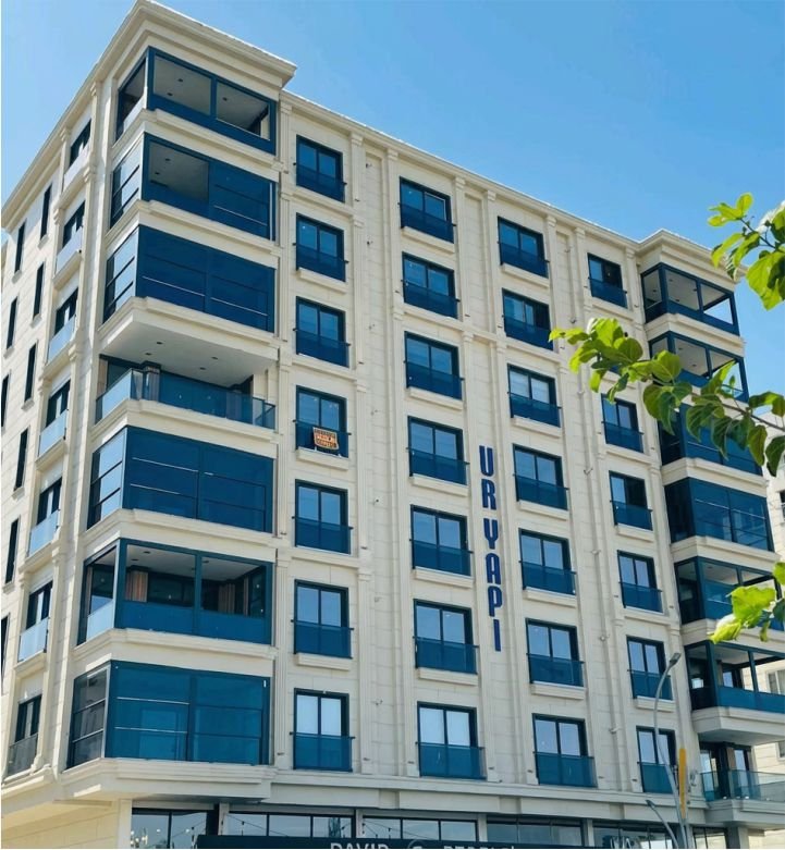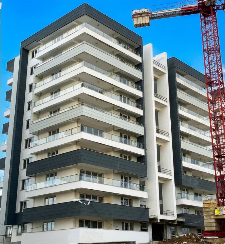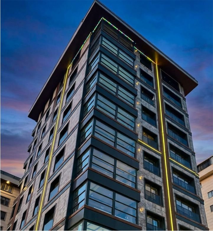 Modern daireler ve zemin kat ticari üniteleri birleştiren estetik giydirme cepheli yaşam merkezi.